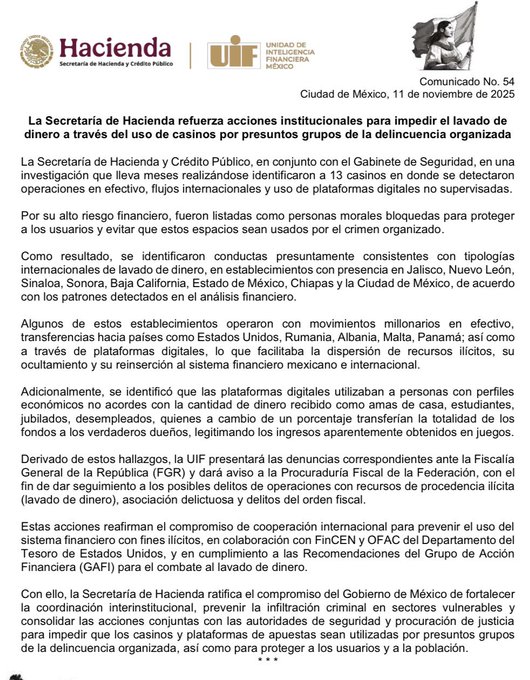 El Gobierno de México desarticuló una red de lavado de dinero que operaba mediante 13 casinos físicos y en línea en Jalisco, Nuevo León, Sinaloa, Sonora, Baja California, Estado de México, Chiapas y la Ciudad de México. La investigación, realizada por la Secretaría de Hacienda, la Unidad de Inteligencia Financiera (UIF) y la Secretaría de Seguridad y Protección Ciudadana (SSPC), contó con el apoyo del Departamento del Tesoro de Estados Unidos y agencias internacionales. Durante la conferencia de la presidenta Claudia Sheinbaum, el secretario Omar García Harfuch explicó que los establecimientos mantenían flujos financieros millonarios hacia países como Rumania, Suiza, Malta y Emiratos Árabes Unidos.