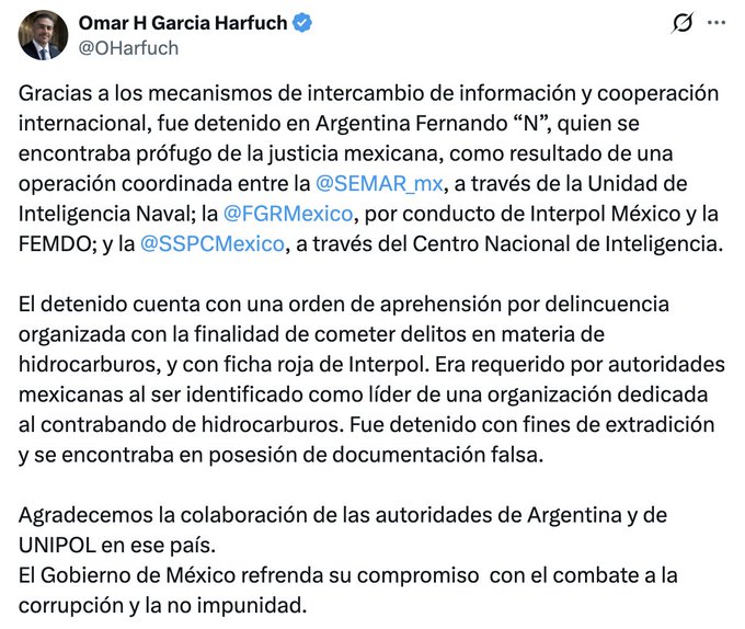 La captura fue confirmada por el secretario de Seguridad y Protección Ciudadana, Omar García Harfuch, quien informó que el exfuncionario contaba con una orden de aprehensión por delincuencia organizada con fines de cometer delitos en materia de hidrocarburos, además de una ficha roja de Interpol que lo hacía buscado a nivel internacional.