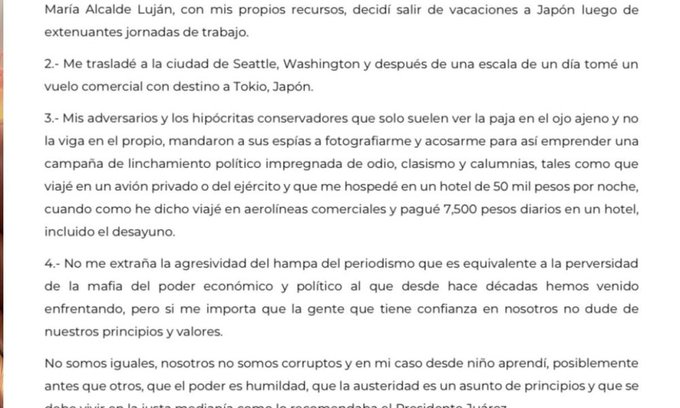 El 5 de agosto, López Beltrán envió una carta a la dirigencia de Morena para aclarar que viajó en vuelo comercial y se hospedó en un hotel de 7 mil 500 pesos por noche, con desayuno incluido, negando haber pagado 50 mil pesos por noche o usado vuelos privados. Luis Felipe Calderón ironizó sobre el mensaje, señalando que era una “aclaración puntual” y cuestionando la “justa medianía” que decía practicar.