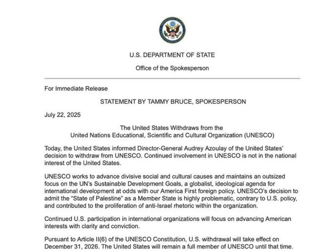 La directora general de la Unesco, Audrey Azoulay, lamentó la decisión, aunque aseguró que el organismo está preparado para enfrentar la salida, ya que su presupuesto ha logrado diversificarse. La ONU también expresó su pesar, pero confió en que la Unesco continuará su labor sin interrupciones.