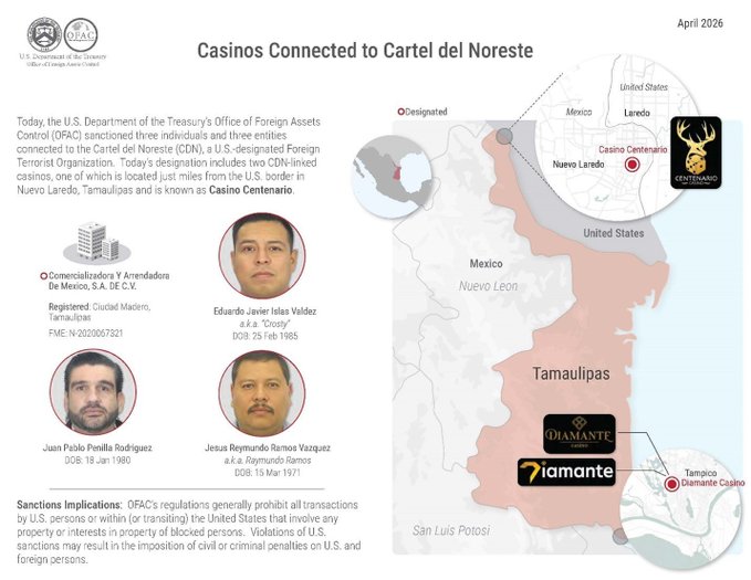El Departamento del Tesoro, a través de la Oficina de Control de Bienes Extranjeros (OFAC), anunció medidas contra dos casinos ubicados en Tamaulipas, así como contra una empresa operadora y tres individuos señalados de facilitar actividades ilícitas.
