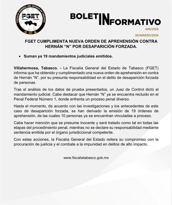 Hernán Bermúdez Requena, exsecretario de Seguridad Pública de Tabasco, compareció ante un juez de control por una nueva acusación en su contra, relacionada con el delito de desaparición forzada de personas.