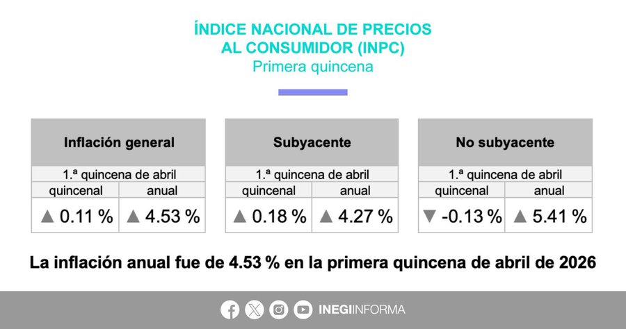 En la primera quincena de abril de 2026, la inflación en México registró una tasa anual de 4.53%, mostrando una desaceleración marginal frente al 4.55% observado en marzo. El Índice Nacional de Precios al Consumidor reportó un incremento quincenal de 0.11%, de acuerdo con cifras oficiales.