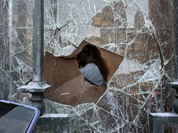 Durante el intento de ingreso, se registraron jaloneos y enfrentamientos con el personal de seguridad. Para contener la situación, se utilizaron extintores, mientras que al exterior se reportó la ruptura de vidrios y daños en los accesos principales.