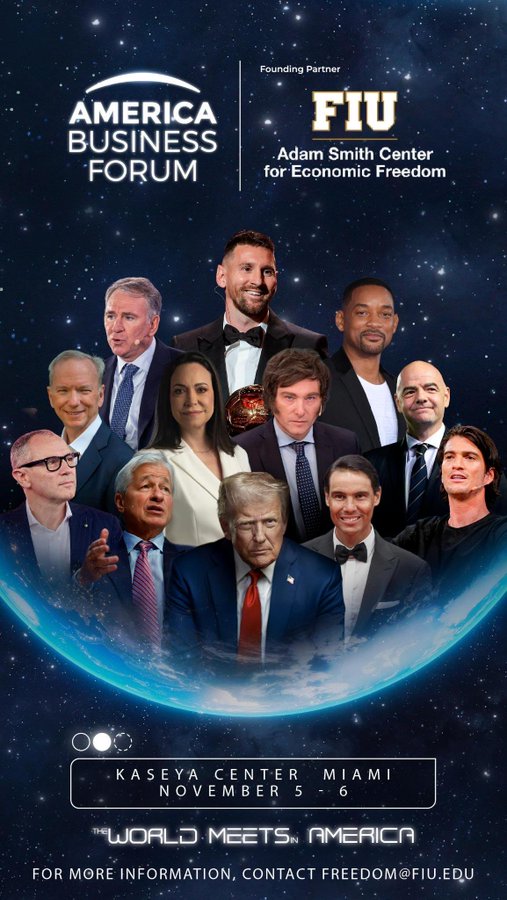 El foro se llevará a cabo este miércoles y jueves en el Kaseya Center de Miami. Participarán personalidades del mundo político, empresarial y deportivo, como el presidente de la FIFA, Gianni Infantino; el titular de la Fórmula 1, Stefano Domenicali; el presidente de JPMorgan Chase, Jamie Dimon; y el fundador de Citadel, Ken Griffin.