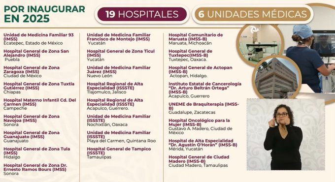 El secretario de Salud, David Kershenobich, informó que en 2025 se inaugurarán 19 hospitales y 6 unidades médicas. Desde octubre de 2024 ya operan 13 hospitales y 8 clínicas, con servicios que van desde atención primaria hasta especialidades.