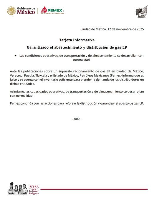“Las condiciones operativas siguen estables. Pemex continúa reforzando la distribución para garantizar el abasto de gas LP en todas las regiones del país”, señaló la compañía.