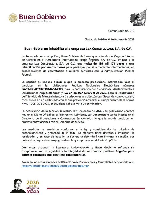 La Secretaría Anticorrupción y Buen Gobierno impuso una multa económica de 189 mil 170 pesos y una inhabilitación por cuatro meses a Lax Constructora, S.A. de C.V., tras acreditar que proporcionó información falsa en dos procesos de contratación vinculados al Aeropuerto Internacional Felipe Ángeles (AIFA).